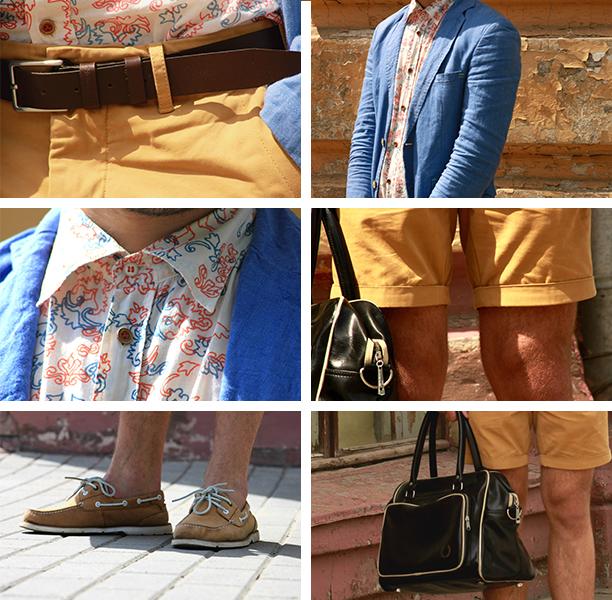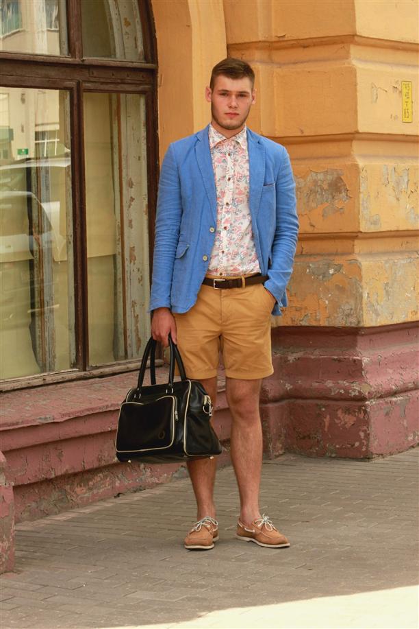На Никите: рубашка Diesel, сумка Fred Perry, шорты Zara, пиджак Zara, топсайдеры Rockport, ремень Benetton.