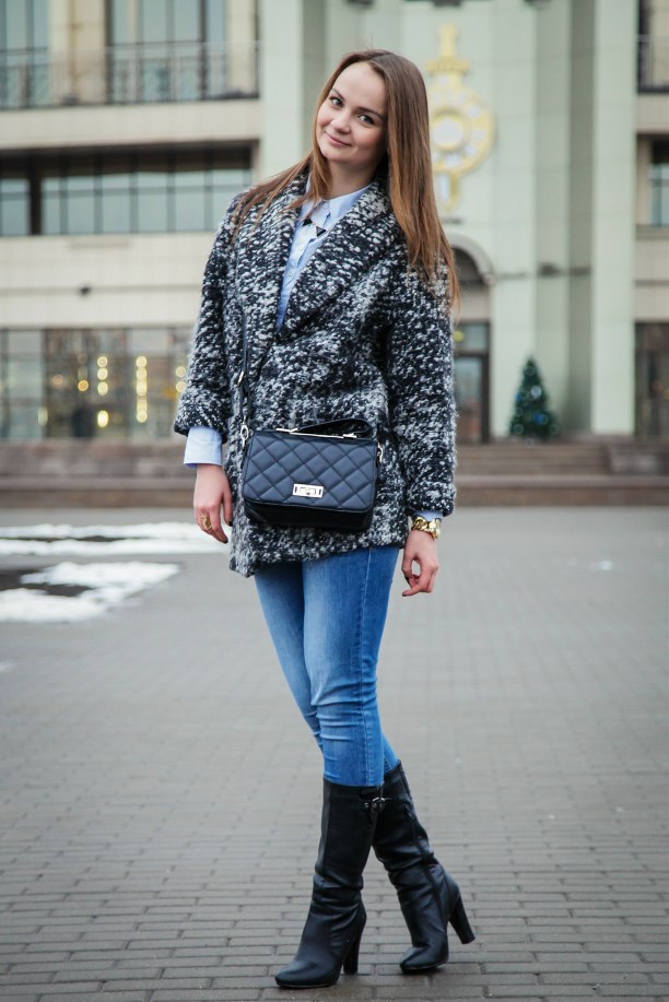 На Кате: пальто Mango, рубашка и джинсы Zara, сапоги Stradivarius, аксессуары H&M, сумка Accessorize.