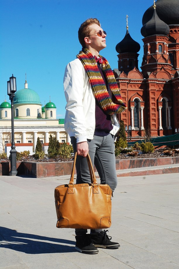 На Кирилле: джинсы Topman, джемпер и кеды Bershka, рубашка и куртка Pull&Bear, бабочка и снуд хендмейд (собственного производства), очки Ray Ban, сумка Zara.