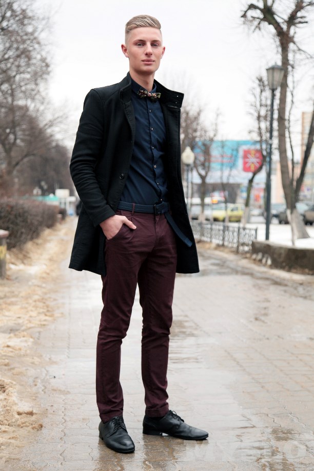 На Викторе: обувь, пальто и брюки — Zara, бабочка — Bershka, рубашка была куплена в ТЦ «Парадиз».