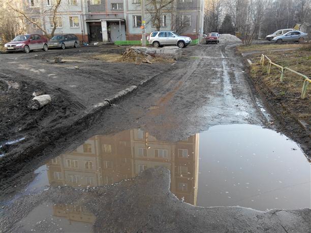 Очень грязно, лужи. Бордюры разрушены, и земля с газонов (вернее, с того что от них еще осталось), развозится колесами машин, течет на тротуары - теперь на них (в смысле, газонах) паркуются автовладельцы. Закон же - он не для всех!
