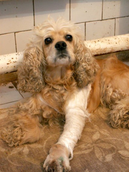Кокер-спаниель Марта попала в "Любимец" летом. Собаке 4-5 лет, она жила у женщины, злоупотребляющей спиртным, скиталась без присмотра по улицам, и ее сбила машина. Марта получила открытый перелом передней лапы и долго восстанавливалась после травмы.
