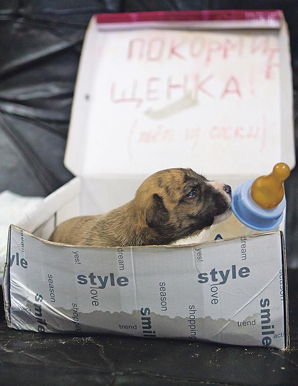 Щенок забавного тигрового окраса подброшен к дверям приюта. Яростно цепляется за свою маленькую жизнь – жадно сосет из бутылочки, пытается ползать. Слегка похож на маленького стафтерьера.