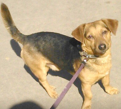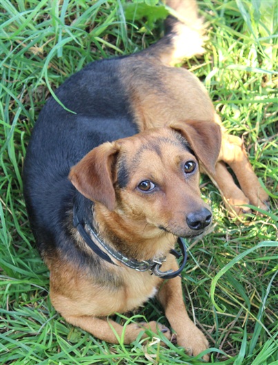 Дворняга смесь с таксой, по размеру как такса. Отзывается на кличку Тимон. На нем был новый белый ошейник от блох и обычный ошейник.