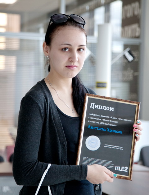 Кстати, именно благодаря своему молодому человеку Настя получила сувениры и почетную грамоту в номинации «Самое большое количество SMS-сообщений» от альтернативного оператора мобильной связи Tele2, в рамках проекта «Жизнь – это общение»
