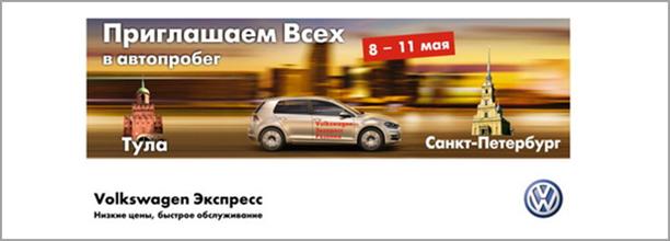 Официальный сервисный центр «Volkswagen Экспресс Рязанка» приглашает всех обладателей автомобилей Volkswagen старше четырех лет принять участие в акции, победители которой получают возможность отправиться на майские праздники в Санкт-Петербург c 8 по 11 мая 2013 г. Вас ждет автопробег Тула – Санкт-Петербург с посещением мест воинской славы и интересная развлекательная программа в городе на Неве.