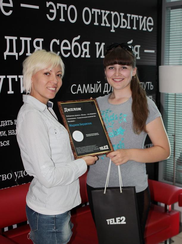 В награду за преданность альтернативному оператору мобильной связи, Марине вручили памятный диплом и сувениры от Tele2.