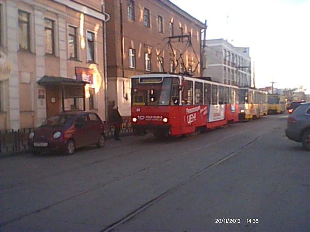 «20 ноября 2013 г. я был свидетелем, как припаркованный напротив техникума им. Мосина с нарушением ПДД автомобиль «ДЭУ-Матиз» М979РР71 перегородил движение трамваев в сторону улицы Советской. Водитель автомобиля (девица лет 30) где-то долго слонялась, и из-за ее машины не могли проехать 4 трамвая. Фото с телефона прилагаю», - сообщил Александр.