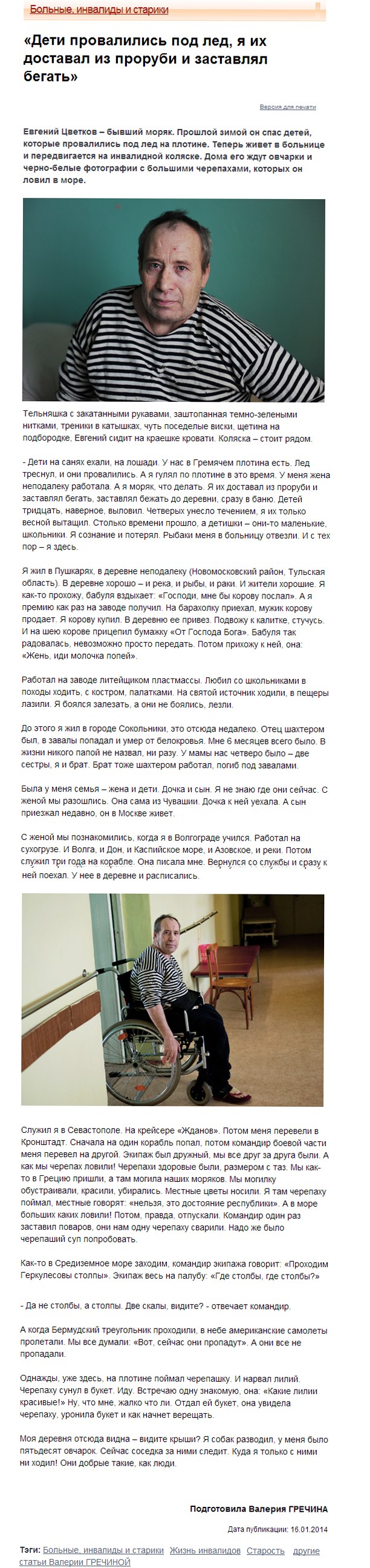 «Дети на санях ехали, на лошади. У нас в Гремячем плотина есть. Лед треснул, и они провалились. А я гулял по плотине в это время. У меня жена неподалеку работала. А я моряк, что делать? Я их доставал из проруби и заставлял бегать, заставлял бежать до деревни, сразу в баню. Детей тридцать, наверное, выловил. Четверых унесло течением, я их только весной вытащил. Столько времени прошло, а детишки – они-то маленькие, школьники. Я сознание и потерял. Рыбаки меня в больницу отвезли. И с тех пор я здесь», - цитирует воспитанника Дома престарелых православный портал: