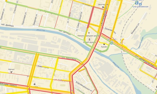 Затор растянулся от улицы Советской по Октябрьской до Арсенальной. Также затруднён выезд с Демидовской плотины.