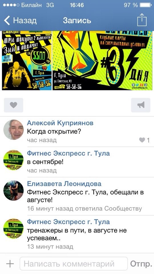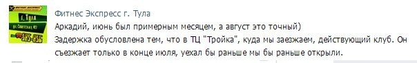 «Проведи остаток лета вместе с „Фитнес Экспресс“!», — гласит девиз в группе спортклуба в социальной сети. Правда, звучит он немного издевательски. Многим тулякам приходится проводить свободное время в борьбе за возврат денег, отданных за клубный абонемент.