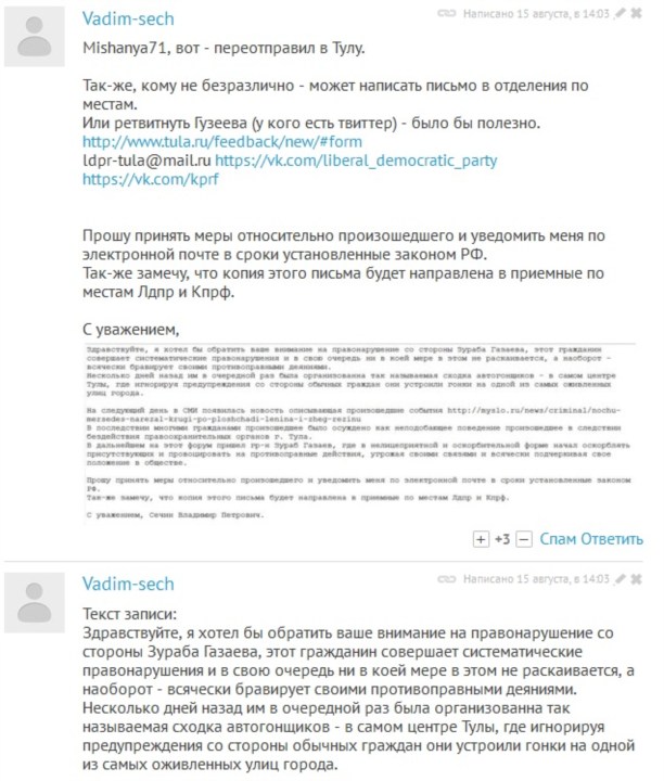 Один из пользователей портала — Vadim-sech в комментариях предложил написать обращение в органы правопорядка по поводу поведения тульского гонщика: