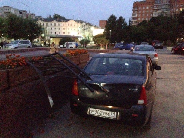 Автомобиль остановился у фонтана возле клуба, попутно снеся часть ограды, куски которой впились в припаркованные автомобили.