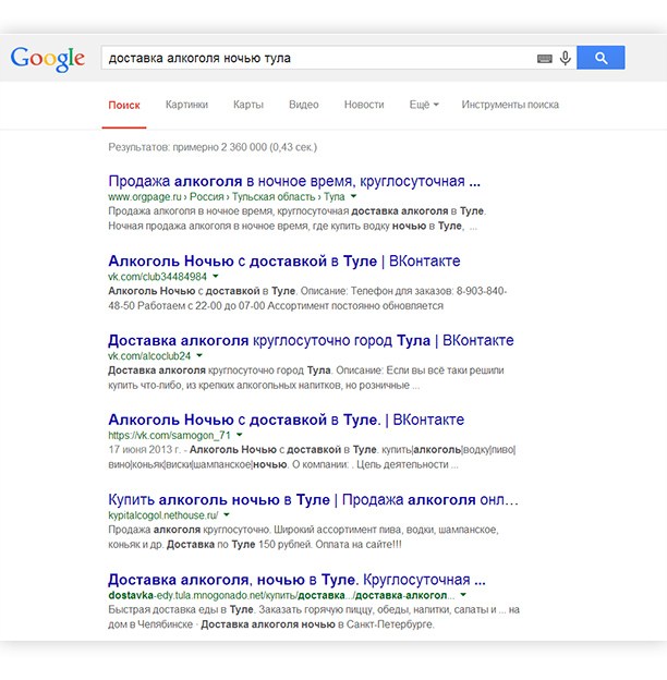 Отметим, что подобных сайтов и страничек в соцсетях на сегодняшний день предостаточно. Это довольно легко проверить, введя в google запрос: «алкоголь тула».