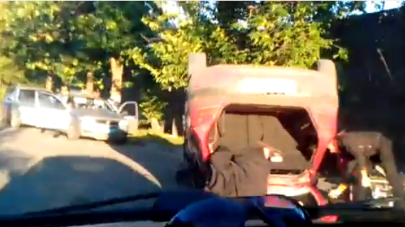 "Красный автомобиль, предположительной пежо или фиат, лежал на крыше, защита картера была оторвана. Жертв вроде нет, но утверждать не возьмусь, т.к. очень устал и хотелось домой."