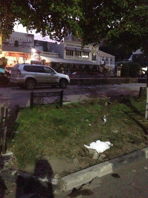 В результате мощного столкновения куски металлического ограждения перелетели через фонтан и вонзились в припаркованные неподалеку автомобили.