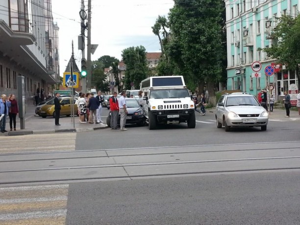 Как видно на фотографии, на повороте на улицу Советскую возле «Гостиного двора» не разъехались лимузин Hummer и Mitsubishi Lancer.