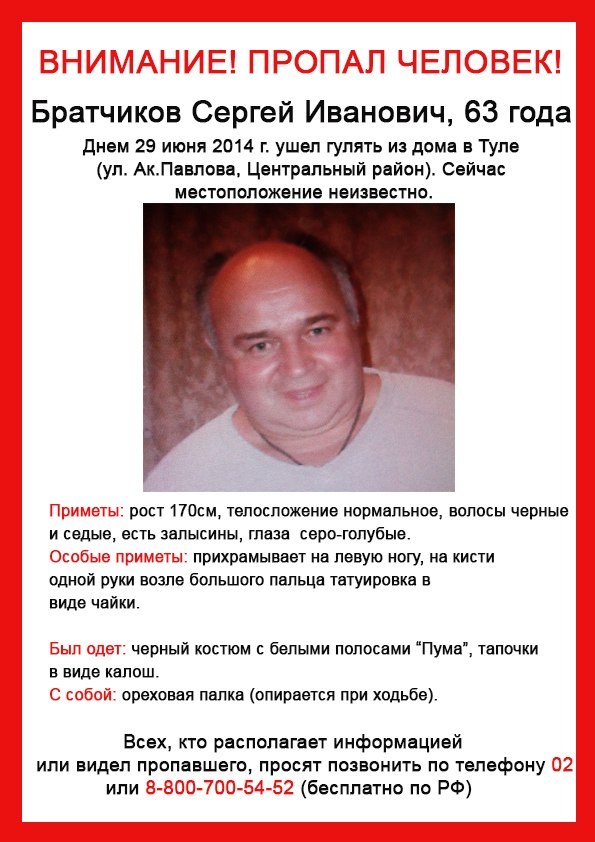 Напомним, что поисковый отряд разыскивает ещё одного пропавшего туляка: 30-летний Николай Анатольевич Мозгов 24 июня возвращался автостопом из Вологды в Тулу и пропал без вести.