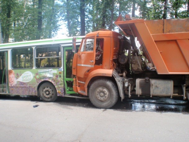 О столкновении пассажирского ЛиАЗа и грузовика КамАЗ сообщили очевидцы. Авария произошла в 13:00 на улице Пржевальского в Туле.