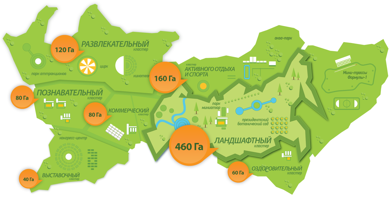В парке планируется разместить спортивные сооружения и зоны отдыха. Гости комплекса смогут увидеть уменьшенные копии достопримечательностей России, ознакомиться с природой, традициями и культурой всех регионов страны.