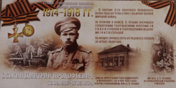 По словам министра культуры Тульской области Татьяны Рыбкиной, гашение почтовой карточки, посвящённой нашему земляку, Герою Первой мировой войны Дмитрию Оськину, – это один из этапов подготовки к празднованию 100-летия начала Первой мировой войны. Также к юбилею на Московском вокзале в Туле откроют памятник участникам войны.