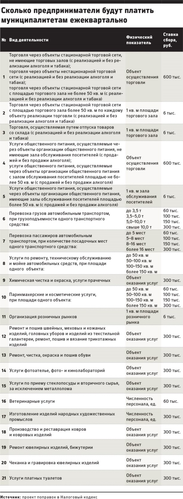 За основу к новому сбору бюджет-комитет Госдумы взял пакет поправок в Налоговый кодекс. Так, объектом сбора «признаётся использование движимого и недвижимого имущества для осуществления предпринимательской деятельности». Размер налога будет зависеть от вида деятельности и размера помещения. За каждый квадратный метр торгового зала или кафе площадью свыше 50 кв. м владелец будет платить по 6 тысяч руб. Если зал меньше или его нет — 600 тысяч рублей раз в три месяца.