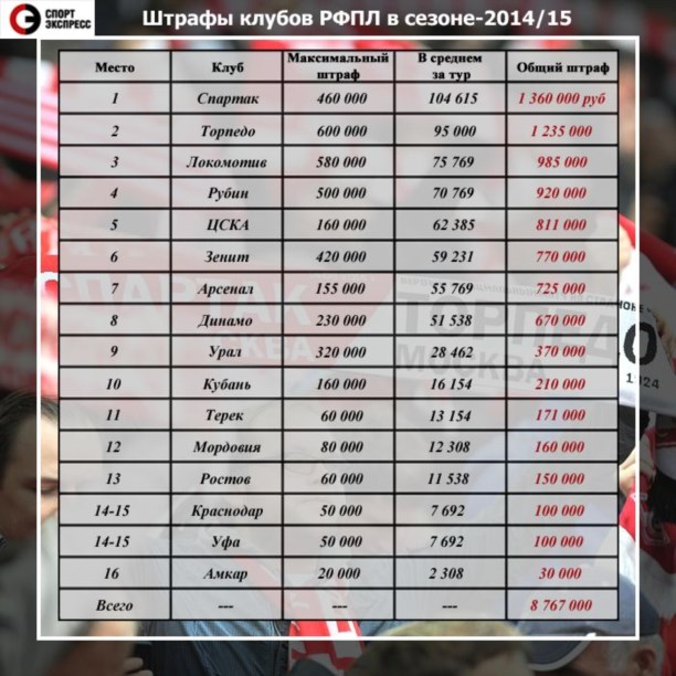 Издание «Спорт-Экспресс» составило рейтинг клубов РФПЛ (основные и молодежные составы), заплативших самые большие штрафы по итогам 13 туров. Тульский «Арсенал», заплативший за различные нарушения 725 тысяч рублей, занял седьмую строчку рейтинга.