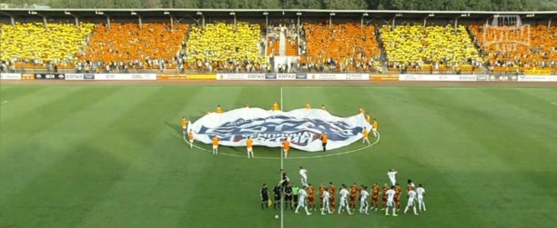 Команды вышли на поле. Их встретили болельщики цветовым перформансом:
