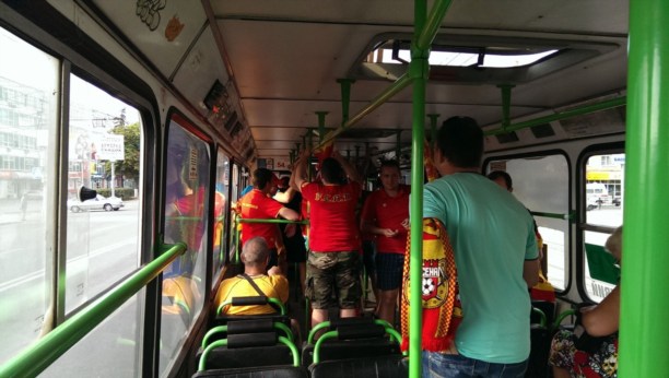 За 1,5 часа до начала матча: Если вы решили поехать на матч на автобусе, знайте - они переполнены. Болельщики красно-жёлтых мирные, но очень шумные (фото Сергея Алексеева):
