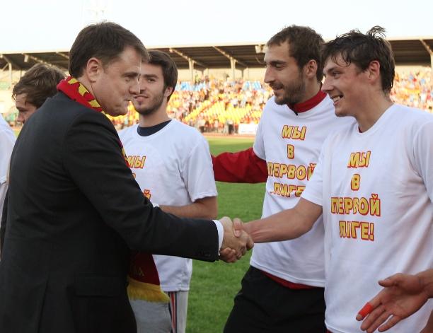 В общем, «Арсенал» одержал заслуженную победу в матче – 2:0, по окончании которого праздник футбола продолжился. Футболисты «Арсенала» надели специально подготовленные майки с надписью: «Мы в первой лиге!», и начали качать своего наставника и главного идейного вдохновителя Дмитрия Аленичева.
