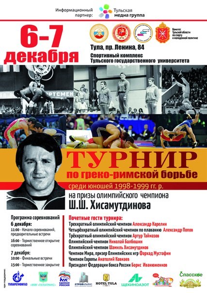 Турнир состоится в физкультурно-оздоровительном центре Тульского государственного университета (пр. Ленина, 84). К участию в соревнованиях допускаются юноши 1998-1999 и 2002-2003 годов рождения на призы Олимпийского чемпиона Шамиля Хисамутдинова.