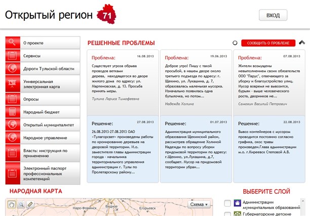 - оpenregion71.ru – портал «Открытый регион». Жители могут обращаться напрямую к органам власти с вопросами, сообщать о проблемах, получить ответ в установленный срок 10 дней с фотографией, подтверждающей решение вопроса. Свалки на улицах, гололед, неработающее освещение в подъездах – для решения этих и других вопросов вы можете обратиться на «Открытый регион». Помимо этого, на сайте доступны более 20 различных сервисов, например, «Дороги Тульской области», «Народная карта», «Открытый электронный бюджет» и др.