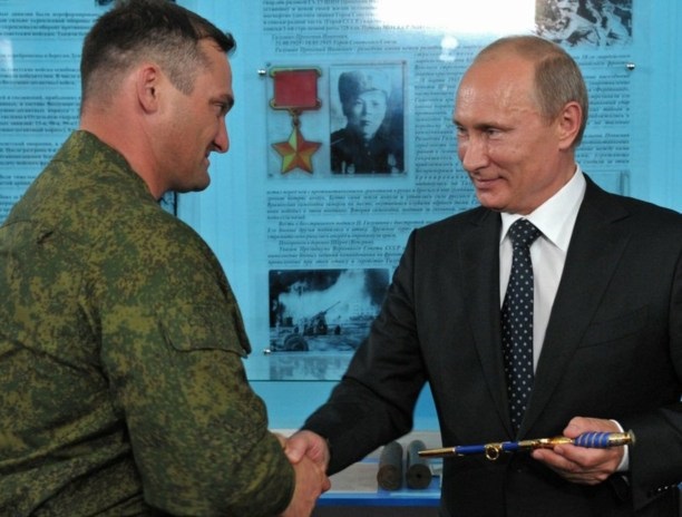 Июль 2012 г. Ульяновск. Комбриг Дмитрий Глушенков от имени личного состава 31-й Ульяновской бригады ВДВ вручил Президенту Владимиру Путину военный кортик с девизом десантников «Никто, кроме нас».