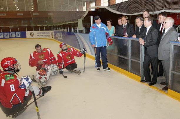 Каждая команда паралимпийцев вручили подарки высокому гостю: хоккеисты - клюшку, шлем и перчатки, волейболисты - мяч. После общения с паралимпийцами началась официальная часть поездки. На совещании по развитию адаптивного спорта для инвалидов премьер поделился впечатлениями от увиденного: