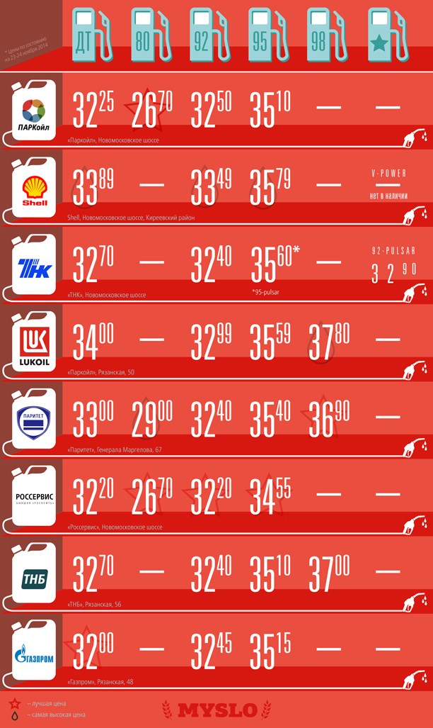 В общем, мы решили выяснить, реально ли тулякам сэкономить на бензине. А то тут пугают, что после Нового года взвоем – по 50 рублей литр! Myslo будет следить за ростом (или, если очень повезёт, падением) цен на топливо.