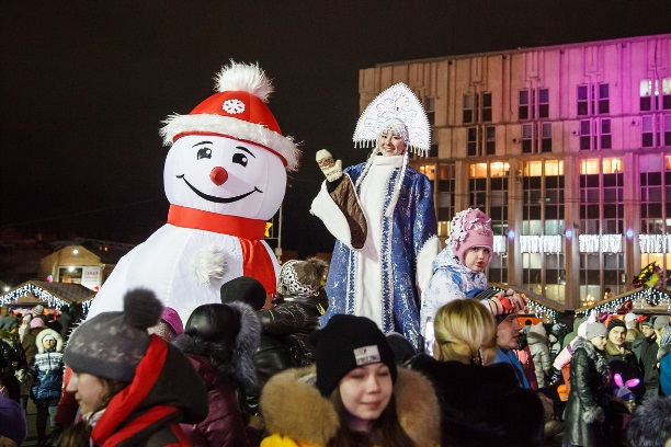 В этом году открытие ёлки началось с карнавального шествия. Ровно в 18.30 сказочные герои стартовали с четырёх точек города к площади Ленина, завлекая за собой прохожих.
