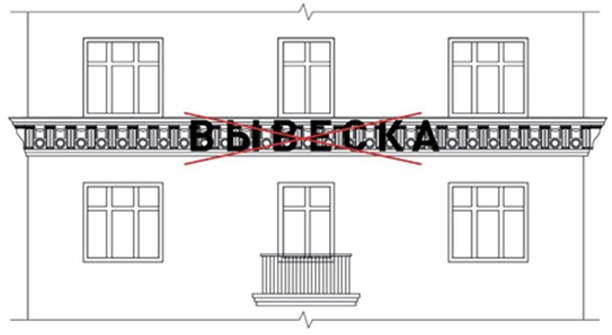 Согласно новым правилам, вывески должны размещаться только в пределах внешней площади помещения, занимаемого объектом, и не перекрывать архитектурные элементы (колонны, пилястры, орнамент, лепнина). Вот так – запрещено: