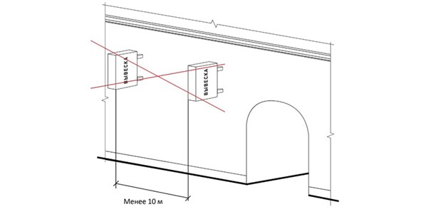 Консольные вывески (двухсторонние рекламные вывески, которые устанавливаются перпендикулярно фасаду и просматриваются с двух сторон) должны располагаться на расстоянии не менее 10 метров друг от друга: