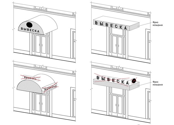 Особое внимание уделено вывескам на козырьках: они могут быть установлены строго в пределах фриза, и запрещается размещение на самой конструкции козырька.