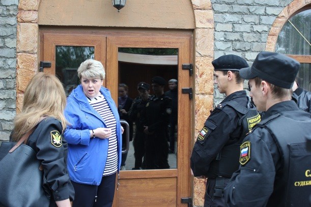 Собственница "гнезда" сначала не пускала приставов внутрь кафе, а потом ругала рабочих, неправильно разбирающих забор.