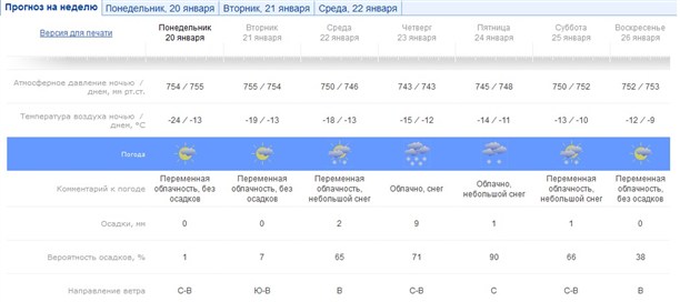 Тем не менее уже с завтрашнего дня мороз начнет потихоньку отступать. Уже с 21 января температура днем повысится на пять градусов (до -19, вместо сегодняшних -24), а к концу недели и вовсе обещают -12 и солнце.