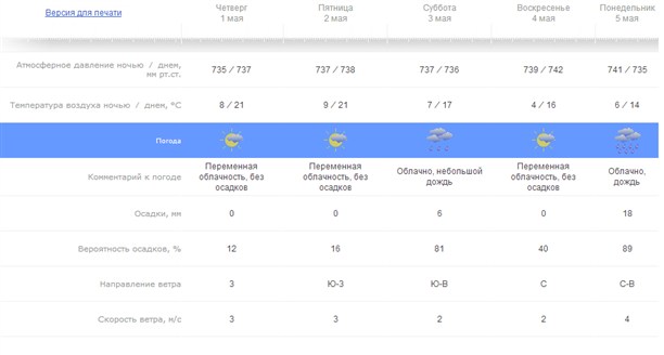 Так, 1 и 2 мая в городе по-прежнему ожидается практически летняя жара в 21 градус выше ноля. Осадки маловероятны. А вот уже к 3 мая температура понизится до плюс 16 и пройдет дождь.