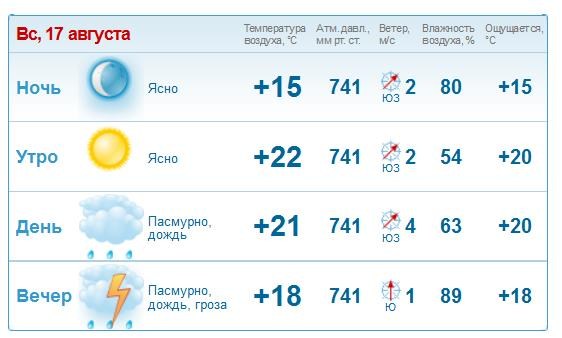В воскресенье погодные условия ухудшатся ещё больше. Днём на улице будет только +21. Пройдут дожди, высока вероятность грозы. Влажность воздуха составит 89%. Ветер юго-западный, 2-4 м/с.
