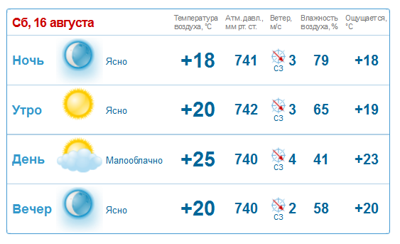 Согласно данным метеоцентра Gismeteo, 16 и 17 августа в регионе резко ухудшатся погодные условия. В субботу воздух прогреется максимум до +25 градусов. Во второй половине дня небо заволокут тучки, но уже к вечеру прояснится. Ветер изменит направление с юго-западного на северо-западное.
