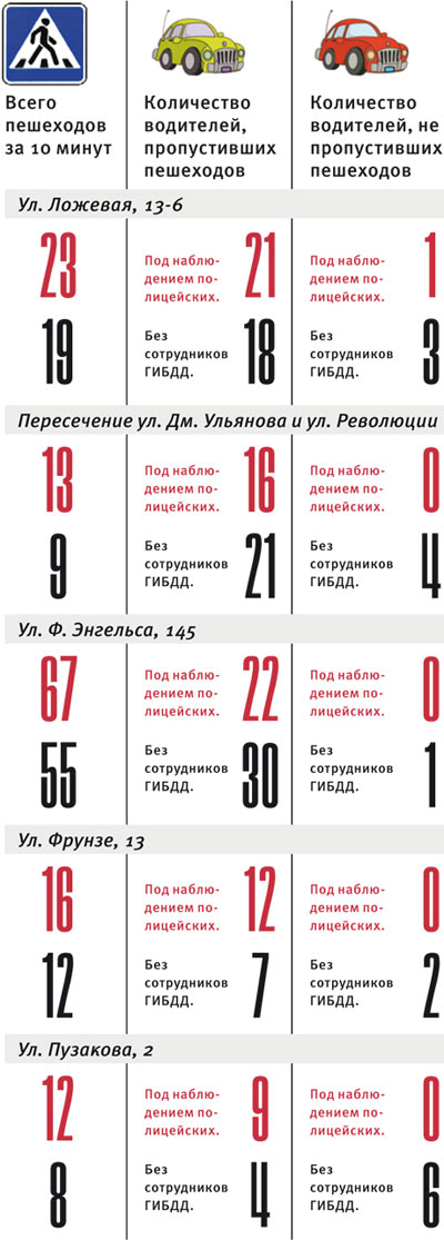 Результаты эксперимента можно увидеть в таблице. Сразу скажем, воспитанных водителей в нашем городе все же большинство. И это радует! Печально то, что при гаишниках дорогу пешеходам уступают в 99,99% случаев.