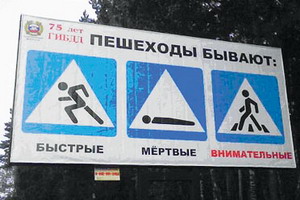 Кстати, было замечено, что наибольший шанс быстро и безопасно перейти дорогу в отсутствие инспекторов ДПС имеет либо группа пешеходов из 2-3 человек, либо просто нагло «прущий» двуногий. Но нужно помнить, что последний безусловно рискует. Наибольшие шансы выжить, но наименьший вариант перейти дорогу у того, кто не ступает на «зебру», а послушно ждет, когда водители остановятся сами. Ага, щас!
