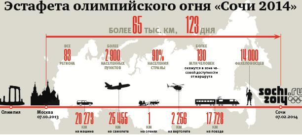 Факел – один из главных атрибутов Олимпийских игр. В его очертаниях угадывается силуэт пера волшебной птицы, цвета – стальной и красный, внутри – газовый баллончик, рассчитанный на 15 минут горения. Факел весит около 1,8 кг. Высота факела сочинской Эстафеты Олимпийского огня - 95 см, ширина - 54 мм. Стоит один факел 12 500 руб.