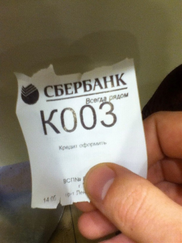 Первым в списке был один из самых популярных банков — Сбербанк. Простым разговором или буклетами тут не обошлось — заставили получить электронный номерок и подождать. Консультант, кстати, освободился раньше, чем удалось оторвать «билетик».