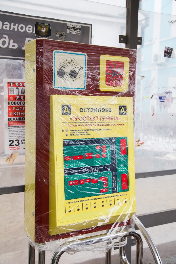 Утром 23 декабря на остановке «Проспект Ленина» установили яркий красно-жёлтый аппарат. Это тактильно-звуковая мнемосхема для людей с ограниченными возможностями.