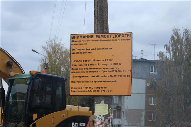 В объявлении, которое висит возле ремонтируемой дороги, сказано, что работы должны были быть завершены к 31 августа 2013 года. Что интересно, подрядчик, ЗАО «Штрабаг», отвечает за асфальтирование большей части дорог Тулы – выиграл тендер на работы, но, как отметили в теруправлении по Привокзальному району, «силы не рассчитал».
